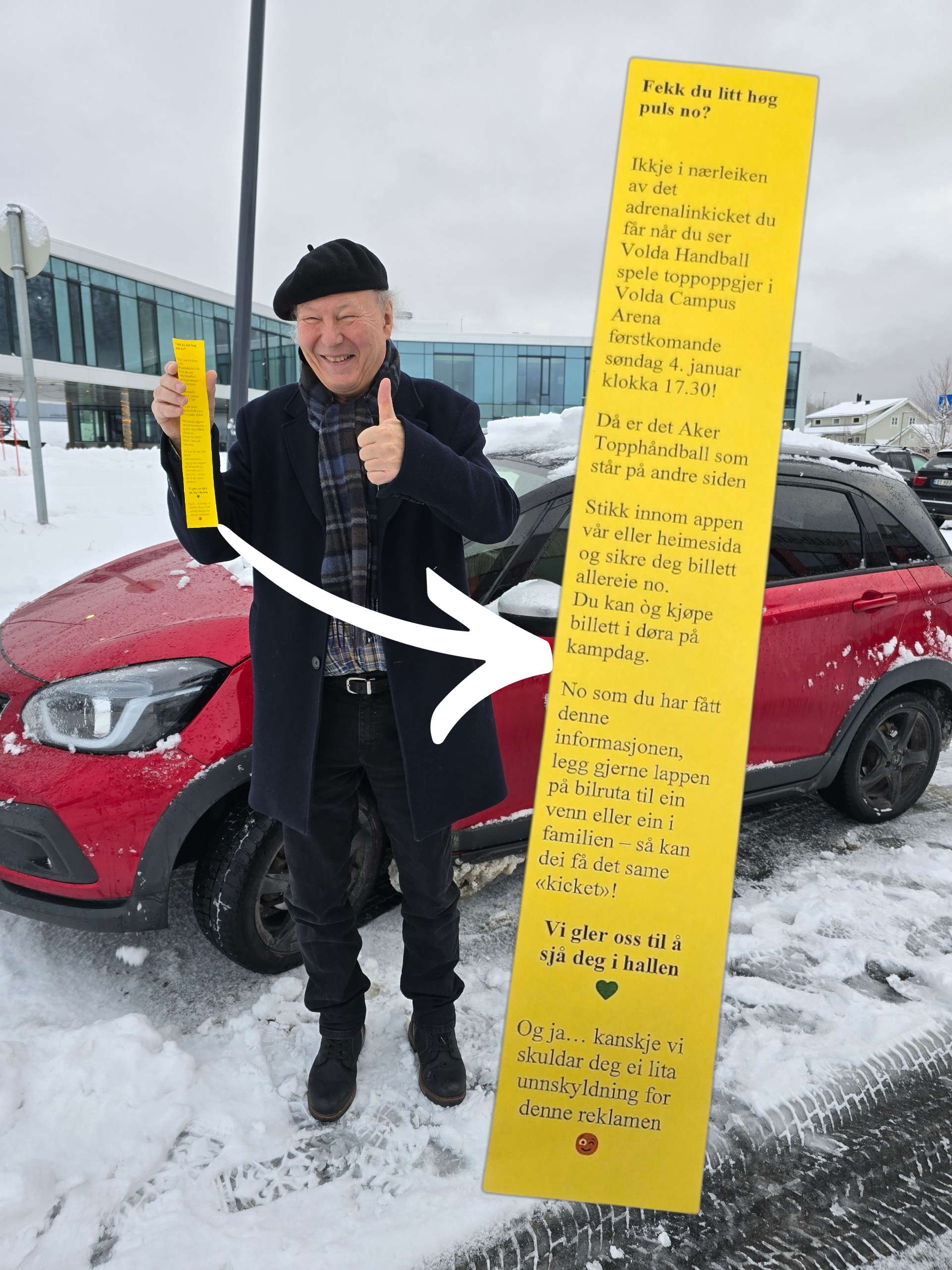 Då er du kanskje ein av dei som fekk eit gult ark på frontruta – som såg mistenkeleg likt ei parkeringsbot ved første augekast. Nokre hundrelappar som fauk rett ut vindauget? Nei då. Denne gongen var det vi i Volda Handball – med god hjelp frå rampenissen – som stod bak sprella.